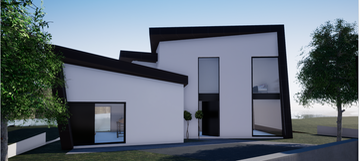 Dans un deuxième temps, j’ai alors pensé à déstructurertotalement la réalisation en décalant carrément les éléments et en ne gardant, comme élément de lien, que l’escalier qui occupe ainsi une position centrale.
