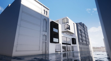 - D’une part, il tient compte d’une analyse complète du quartier environnant(photo 1). Celle-ci montre qu’il n’y a pas d’uniformité dans les hauteurs de bâtiments. Le terrain se situe entre un bâtiment à trois niveaux sur la gauche et un à six niveaux sur la droite. J’ai donc souhaité faire unlien, une transition douceentre ces deux hauteurs en créant un bâti allant de trois niveaux à gaucheà cinqniveaux sur la droite.